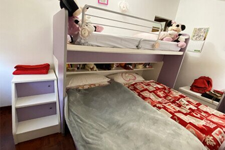 Adatto ad una famiglia che ha una, due o tre bambine; infatti i letti sono tre. Per salire al posto alto c'è la scaletta contenitore, e la passerella che facendo scorrere in avanti la struttura si apre come da immagini pubblicate.